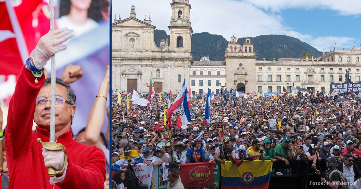 Para la una de la tarde, en la Plaza de Bolívar no había donde ubicarse. Las arengas empezaron cuando la pantalla mostró a un Gustavo Petro de saco rojo caminando desde la Carrera Decima con la espada de Bolívar. Ya en tarima, se tomó el micrófono durante una hora donde criticó a la Comisión Séptima del Senado que le hundió su Reforma Laboral. Comparó a los senadores con el velo negro que hoy tiene encima el edificio del Congreso, que se comparó con “una mortaja negra” que los hace creerse los reyes del pueblo colombiano.