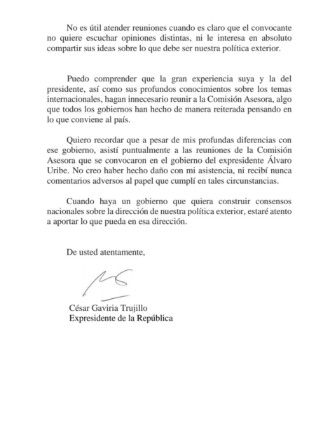 El tono de la carta del ex Presidente Cesar Gaviria fue duro y claramente mientras informaba de su inasistencia a la Comisión Asesora de Relaciones Exteriores aprovechó para marcar distancia nuevamente.