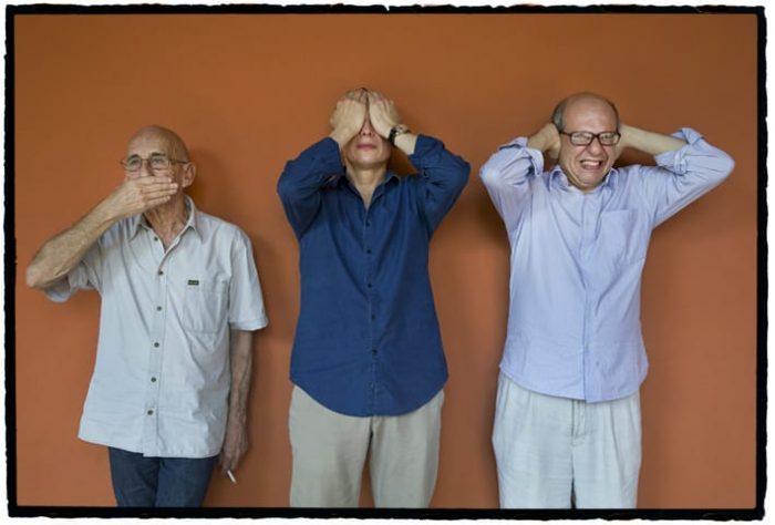 Los directores Fabio Rubiano, Sandro Romero Rey con el dramaturgo José Sanchis. Foto: Daniel Mordinski.