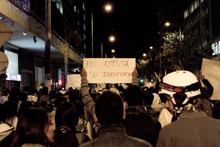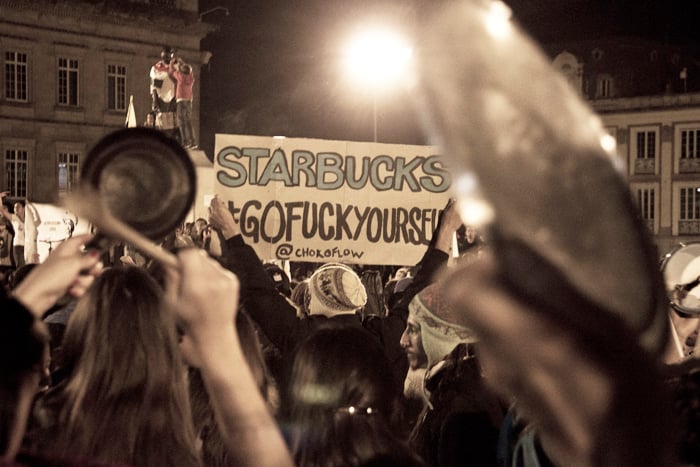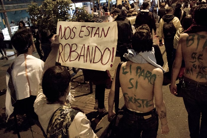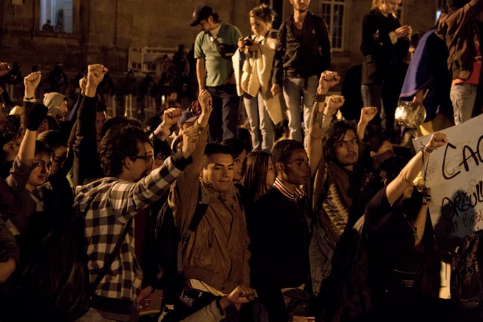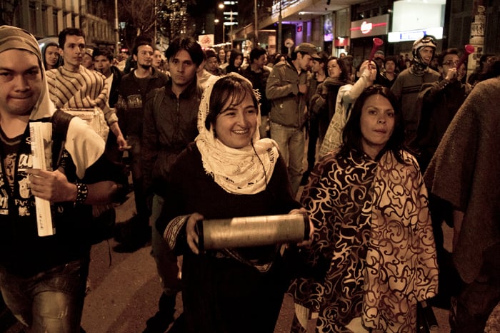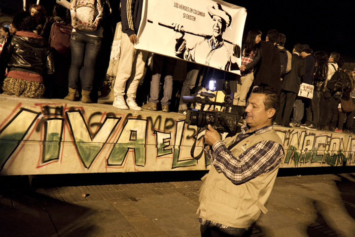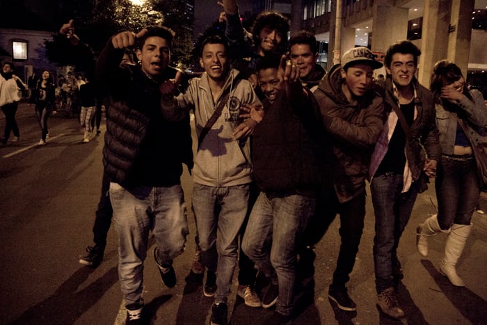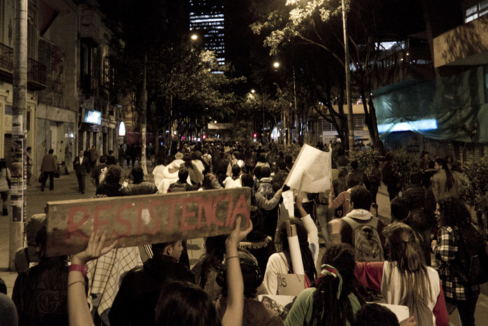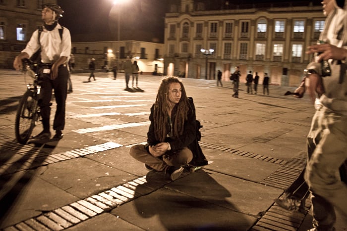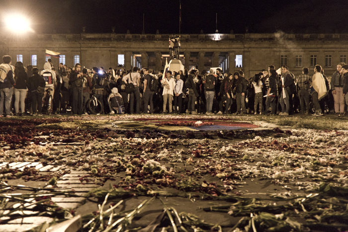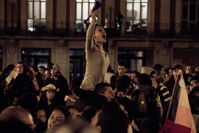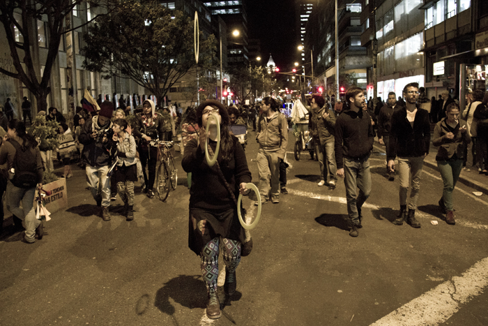 Como periodista que no soy le vengo contando, no lo que sucedió, porque no soy omnipotente, sino lo que viví. Y si le soy aún más sincero… Me urgió un poco de agua, así que salí del océano por un momento, otra vez por la diez subiendo. Soñaba con alcanzar la casa, beber agua y sentar las palabras en su punto de ebullición. Pero no se imagina usted el miedo, la soledad, el silencio; no en mí sino en la calle desierta, débil y abandonada, tensa y potencialmente peligrosa. Me sentí irrelevante, indefenso, cuando tres cuadras atrás tenía aliento. Todavía retumbaba el eco de la bulla, cada vez más lejos. El cacerolazo desde aquí parecía un “evento cultural” promovido por la alcaldía de Bogotá y parecía que a nadie, en este crucigrama que es la ciudad, le importase gran cosa. Hemos de reconocer que de un tiempo para acá éste se ha convertido en un espacio controlado para la manifestación de desamores; peatonalizada la séptima marchamos sobre un paso comercial y por más que gritemos no nos escuchará todo el pueblo. Debemos hacer de la protesta una forma de comportamiento en donde nos manifestemos constantemente honestos y abiertos con nuestros vecinos, frente a lo que nos concierne a todos. Para esto no es necesario ningún tipo de violencia… Entonces me sentí desilusionado cuando tan solo dos o tres cuadras a la redonda reinaba aún el silencio, el mismo que en los rostros de los militares al acecho. Toda la calle debería estar en zaperoco. No conquisté la colina, era perseguido y vigilado. Entré a la tienda de la esquina de la diez con cuatro para rescatarme del desamparo. Una cliente se asustó con mi presencia. Yo en cambio volví sobre mis pasos y saludé con decencia. Calmada la sed, la mirada prevenida del tendero se posó sobre mí. Comenzó como preguntando con recelo ¿usted hace parte de algo? Terminamos dándonos la mano y bendiciendo, el uno al otro, nuestra senda; porque hablamos, y sin haber aclarado en ningún momento si éramos diestros, ambidiestros o izquierdos: compartimos, como se comparte la papa, las palabras. Así supe entonces que no éramos solo los de allá en la plaza. Ya los viejos desgarraron las voces en su tiempo, hoy aprendemos de ellos.