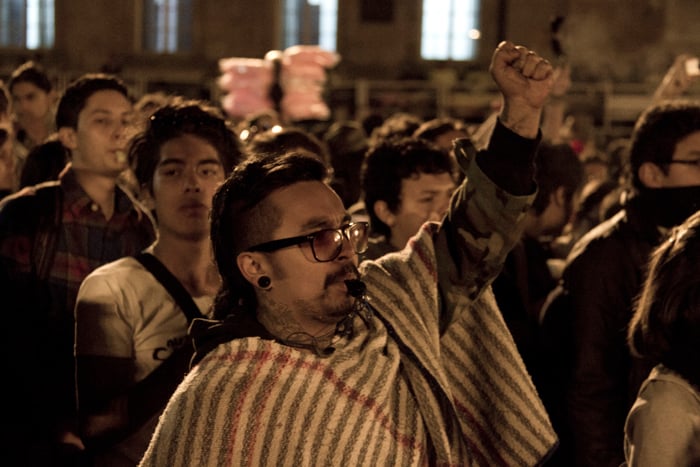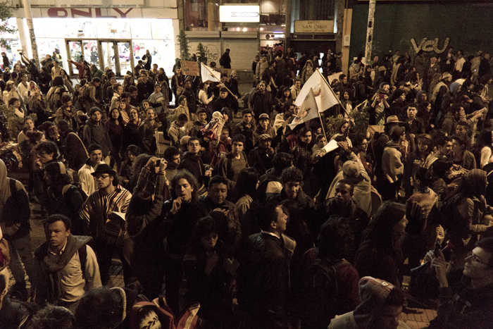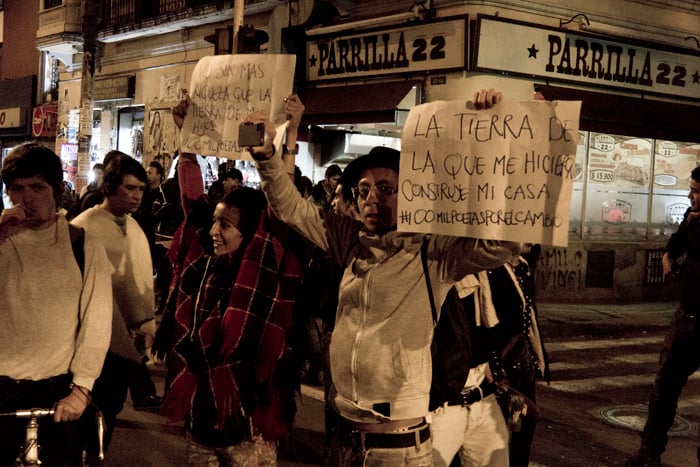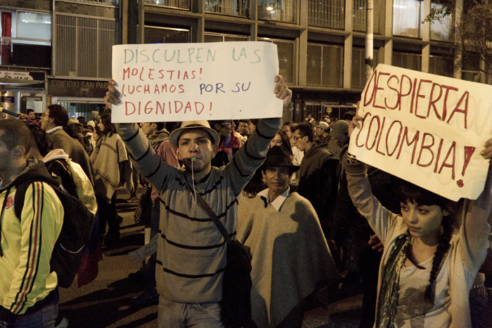 Aterrizando sobre la carrera séptima fundimos nuestra voz con el aliento del pueblo. Así fue que se formó, mirá, qué bullerengue sabroso. Y duró más de cuatro horas. No fueron balas sino tambores, ollas, zapateos, maracas y cotorreos. Respondíamos, no por medio de virtuales avatares y mensajes lumínicos de internet, sino con el pellejo envuelto en ruana y las gargantas erguidas hacia el cielo abierto, ante las altas cortes y al señor presidente quien días atrás negaba la existencia de los problemas, imagínese usted el descaro; pero eso le ayudó para que nos diéramos cuenta de los ridículos y perversos intereses del gobierno, ejerciendo poder sobre lo que es nuestro. Ah, que qué era lo que gritábamos? bueno, unos pedíamos chicha, otros maíz pero en realidad todos exigíamos a las multinacionales fuera del país. Ellos no entienden ni se molestan por entender que vivimos en una tierra fértil cultivada en armonía durante miles de años por nuestros ancestros. Aquí no hay nada que no de fruto. Y entonces ¿por qué nos están obligando a comprar semillas alteradas genéticamente? (ver -documental 9.70-) Dizque para mejorarlas, pero ¿qué mejoras le vamos a hacer a la naturaleza si es ella la vida misma?…