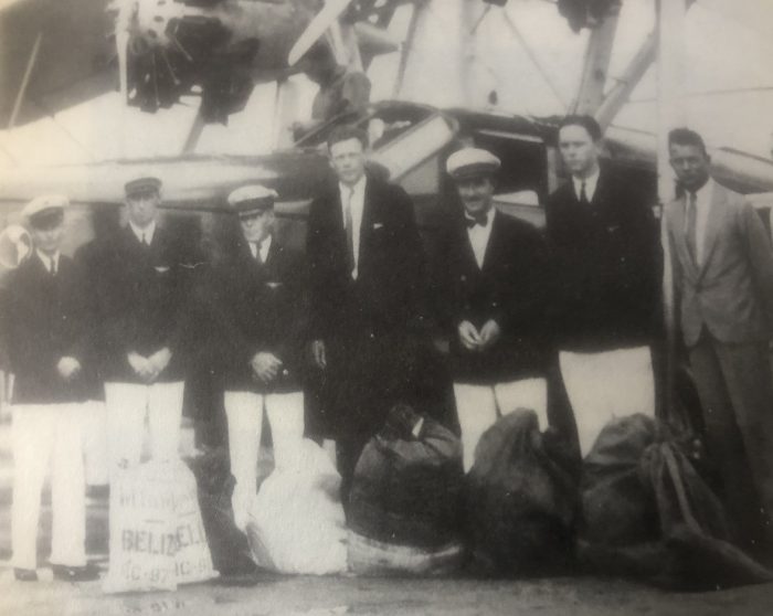 Charles Lindbergh con la tripulación del avión Sirkorsky de la aerolínea UMCA antes del vuelo inaugural de la ruta Medellín – Turbo – Panamá. (Tomada del libro “Don Gonzalo Mejía. 50 años de Antioquia”)