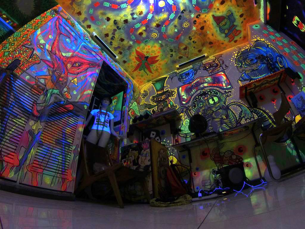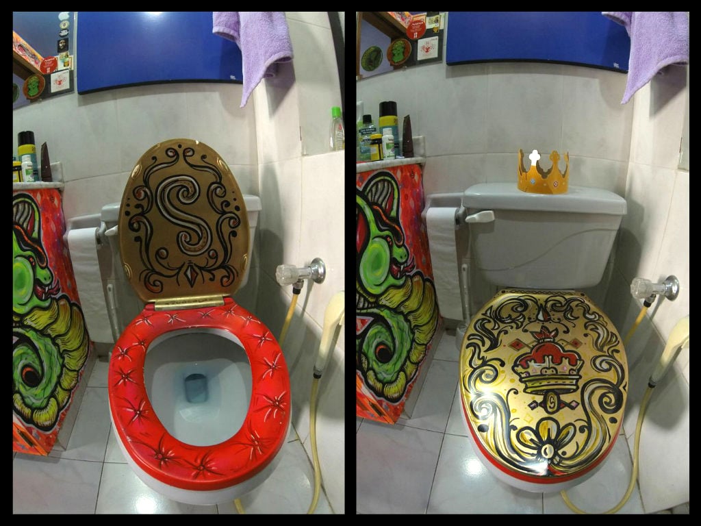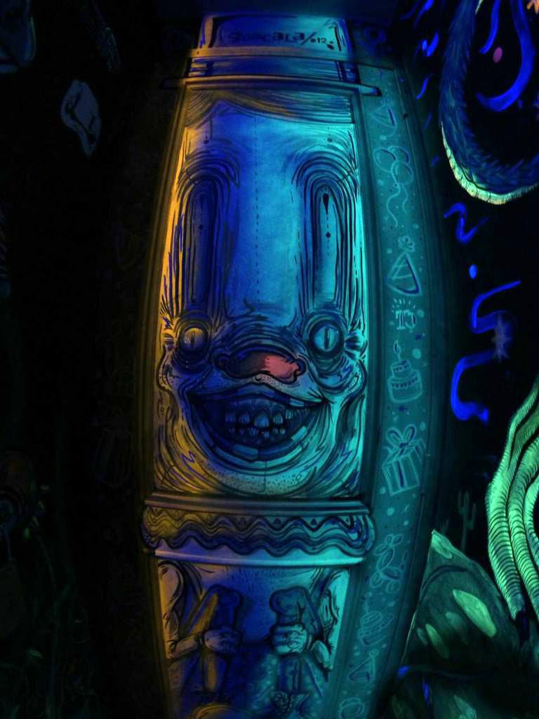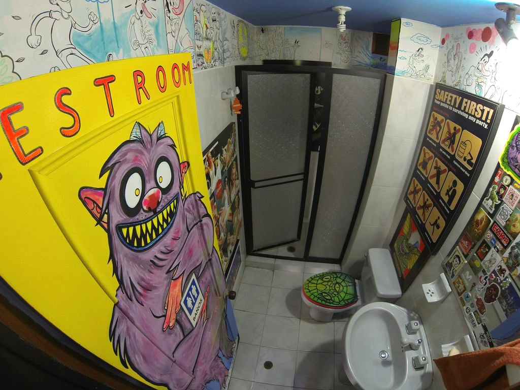 Con la llegada de más y más apasionados por el dibujo se hizo necesario ensanchar linderos. Salir del cuarto. La decisión fue un tanto difícil; empezaron por los objetos: el calentador, los inodoros, las alacenas, una mesa por aquí, una lámpara por allá. Los inodoros fueron un ítem bastante curioso y original al que cada artista animó, dio vida y personalidad. Y esto recoge el espíritu de este apartamento: un constante juego entre el que llega a descubrir por primera vez y los incontables misterios que encierra el lugar. Se descuelga un cuadro y aparece un grafiti o una ilustración, abrir el baño implica ver un comic circular de Jim Pixel y además apreciar un monstruo dispuesto a comer tus desechos o un cómodo trono que ya tiene dueño. Cuadros detrás de cuadros, objetos escondidos, dibujos pequeños y grandes, unos que brillan en la oscuridad, que cuentan una historia, y que te mantienen enganchado por horas sin tregua.