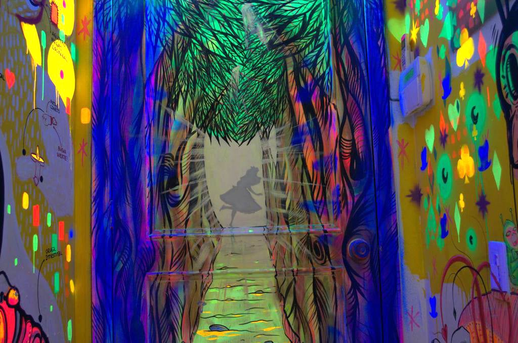 La temática propuesta fue Alicia en El País de las Maravillas, en parte por los viajes que este libro sugiere, migraciones al interior de uno mismo, hacia la imaginación y al intelecto de cada quien, un libro que invita a preguntarse por la existencia y a imaginarse otros mundos. Para empezar, un dado decidió el que escogía la pared más visible. Desde ese momento se prolongó la primera sesión por dos días seguidos en donde se les suministró todo el material tanto para trabajar como para resistir tan arduo reto. Comida y pintura a veces saldaban la deuda del dibujo y hacían que el amor por el arte fuera en últimas el motor del pincel y el spray.