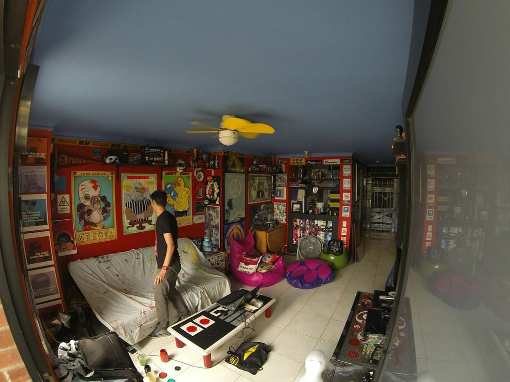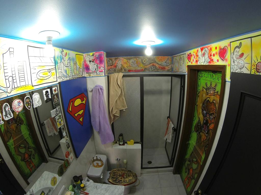 Este es el apartamento de Santiago, en Cali, quien resolvió hacer de su apartamento una Casa- Museo, una especie de catedral del grafiti. Un diseñador de interiores que decidió traerse el Street art ha su casa. Tiene un concepto más bien maximalista en contraposición a la estética minimalista; no deja un centímetro cuadrado de las paredes sin un dibujo.