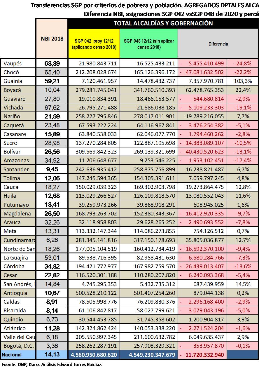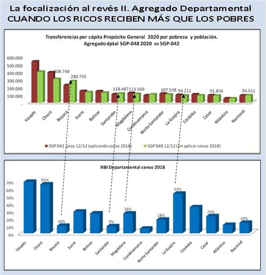 Y así sucedió. En febrero pasado el gobierno hizo la primera distribución con el documento SGP-042, aplicando el nuevo censo, y las cifras beneficiaron con mayores recursos a municipios de Chocó, Córdoba, Bolívar y Magdalena, los más “pobres”, y perjudicaron con menos recursos a municipios de Boyacá, Cundinamarca, Cauca y Santander, los “más ricos” o “menos pobres”. Tal cual lo ordenan las normas de focalización.