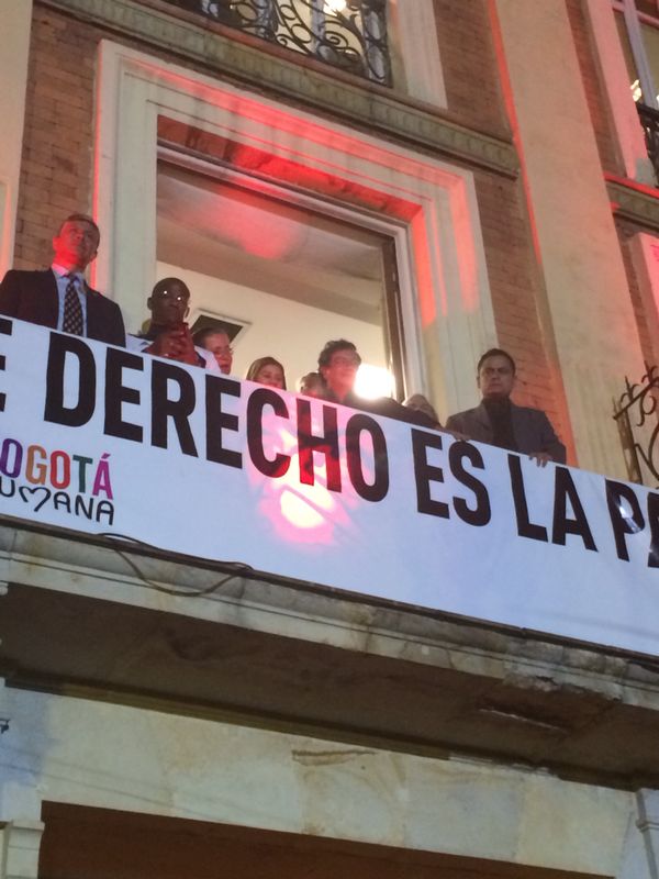 El Alcalde no aguanto su ausencia de visibilidad y aunque sus asesores recomendaron prudencia, este irrumpió de nuevo desde el balcón que desde ayer luce decorado con una pancarta que dice: "el Estado de derecho, es la paz”