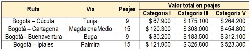 ¿Cuánto se gastaría en peajes por recorrido en cuatro rutas específicas hacia dos de los cuatro puntos cardinales de nuestro país desde Bogotá (Cundinamarca) en tres distintas categorías? En la ruta Bogotá – Cúcuta (vía Tunja) un turista con carro (categoría I) puede toparse con nueve peajes y pagar hasta $67.900.oo y un transportador (categoría V) unos $264.200.oo en total. Si estos mismos personajes (turista y transportador) decidieran cambiar su rumbo hacia Cartagena (vía Magdalena medio) aumentaría el número de casetas de cobro a quince y el pago prácticamente se duplicaría a $120.300.oo y $454.800 respectivamente. Lo mismo sucedería en la ruta Bogotá - Ipiales vía Palmira la “Villa de las Palmas”.