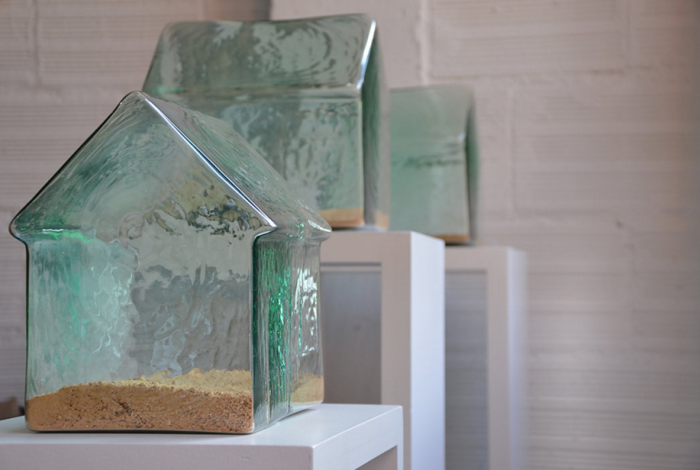 Al final tiene una instalación de casas en vidrio muy trasparentes y vacías. Serie que ella llama Implosiones donde se pregunta sobre las relaciones humanas, el sentido del hogar que es sinónimo de calor. Y la artista dice: "El cocinar, conversar, discutir es un plural que se convierte en singular".