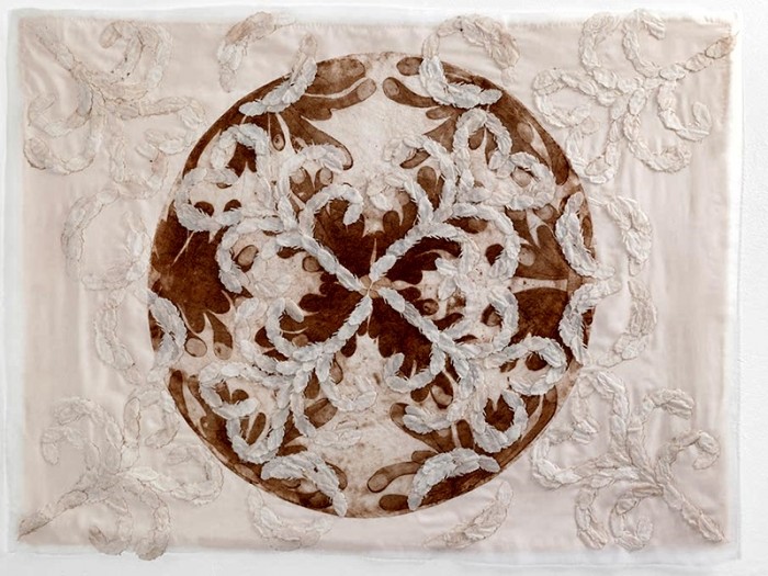 También hay obras de Verónica González que construye paisajes con seda, papel y grabado sobre seda y lino. Un concepto contemporáneo que implica técnicas para lograr unas construcciones simétricas que busca, la cotidiana práctica de una poética.