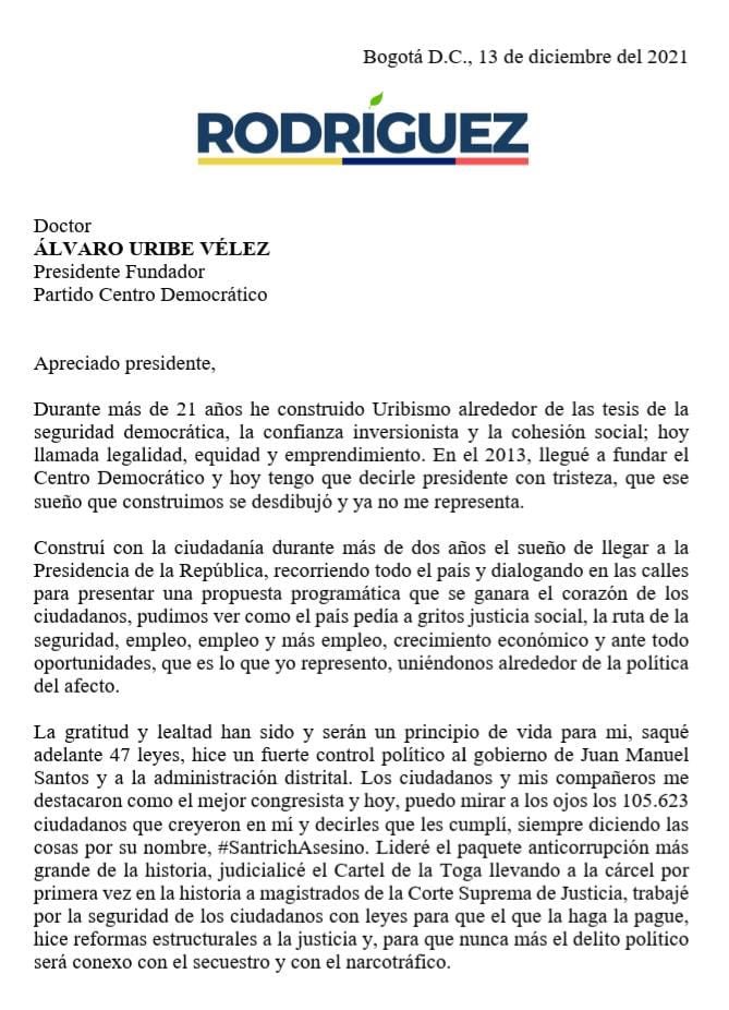 En esta carta dirigida al expresidente Uribe, el representante a la Cámara, Edward Rodríguez, renuncia al Centro Democrático bajo el argumento de que el Comité de Ética del partido lo excluyó, sin motivo alguno, de ser uno de los seis precandidatos presidenciales del uribismo. Además, expresó su inconformidad con las directivas y que lo habían maltratado, precisando que su dignidad no se negociaba. El malestar del representante contra las directivas del Centro Democrático no es nuevo, sus roces con la directora del partido, Nubia Stella Martínez, fueron constantes en el último ya que es ella la encargada de otorgar los avales dentro del partido.