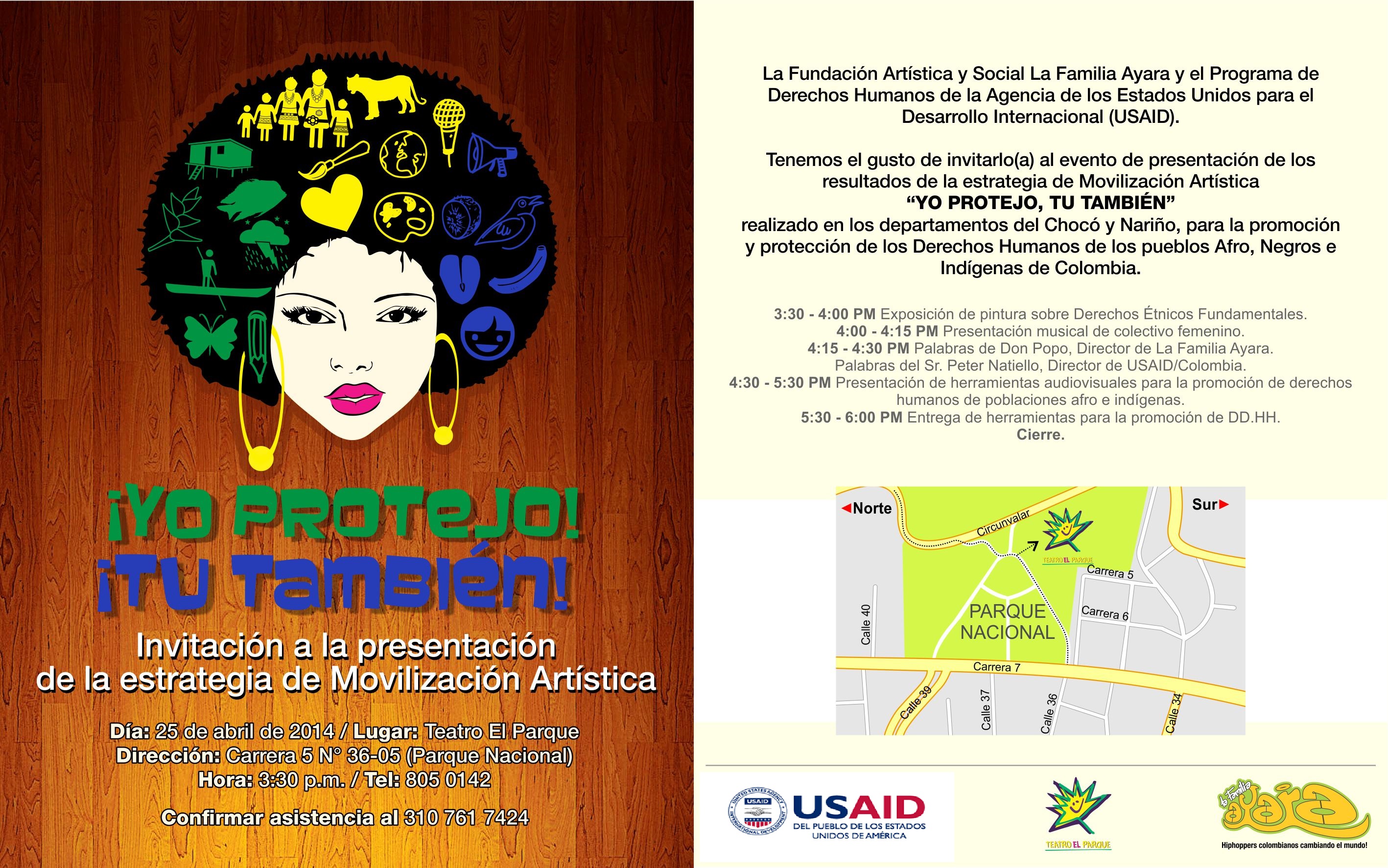 Entre agosto de 2013 y abril de 2014 la Organización Familia Ayara adelantó la campaña de movilización artística #YoProtejoTuTambien con base en un trabajo adelantado con niños, niñas y jóvenes de los municipios de Tadó, Condoto, Lloro, Bagadó en Chocó y de Tumaco en Nariño. Su resultado fue la construcción colectiva de 6 videos y 30 canciones inspiradas en los derechos de estas poblaciones, que se presentará al público el viernes 25 de abril, en el Teatro el Parque (Parque Nacional).