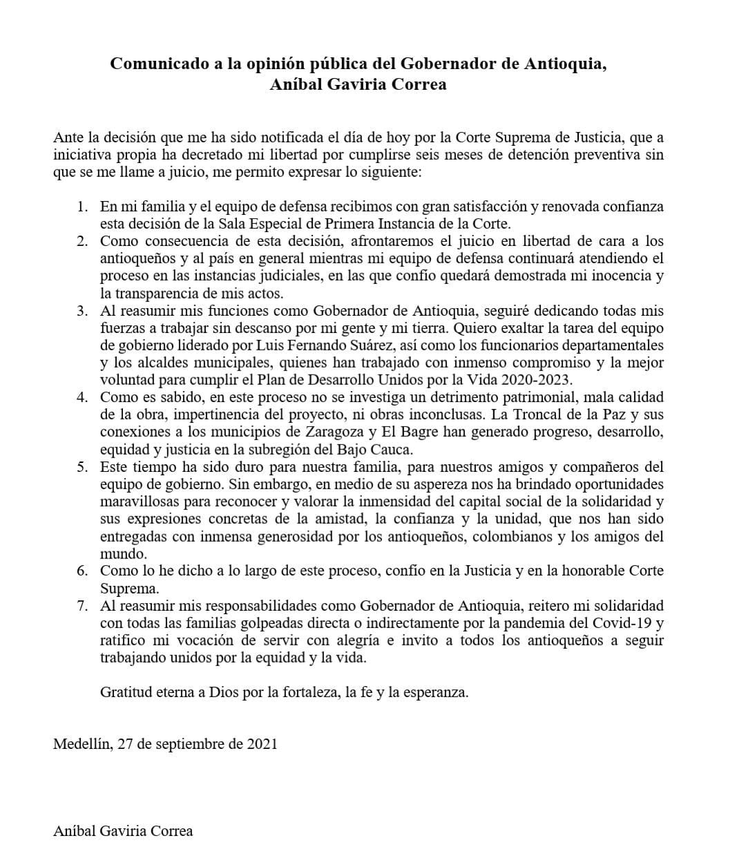 Este fue el comunicado del Gobernador de Antioquia a la opinión pública: