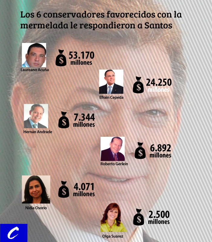 Marta Lucia, embestida por el liderazgo que le confieren sus dos millones de votos y el tercer lugar en la primera vuelta presidencial, lo esperó junto a su familia y acompañada de patriarcas del partido como el exsenador Enrique Gómez Hurtado (hermano del asesinado líder conservador Álvaro Gómez Hurtado) del expresidente del partido Carlos Holguín, así como el expresidente Pastrana que aunque no estuvo presente, hizo un pronunciamiento político expresándole todo su respaldo. También se sumó al de un grupo de parlamentarios que acompañaron la adhesión, como José Darío Salazar, José Hernando Pedraza, Nora García, Miriam Paredes, Cardo Enrriquez, Juan Manuel Corzo, Samy Merherg, Juan Mario Laserna, Cesar Tulio delgado y Mauricio Delgado así como de un grupo de 26 representantes a la Cámara encabezados por David Barguil. Otro grupo que corresponde a la otra mitad de la bancada conservadora, optó por quedarse con el presidente Santos. El bloque parlamentario más favorecido con los mil millones en cupos indicativos o “mermelada” que el gobierno repartió y de los cargos directivos en las entidades del sector agrario, liderado por Efraín cepeda, Hernán Andrade, Roberto Gerlein, Laureano Acuña, Olga Suarez Mira, Carlos Barriga, Arturo Yepes, Nadia Blell y Pedrito Tomas Pereira entre otros, se apartaron de una alianza con Zuluaga y resolvieron seguir jugados por la reelección.