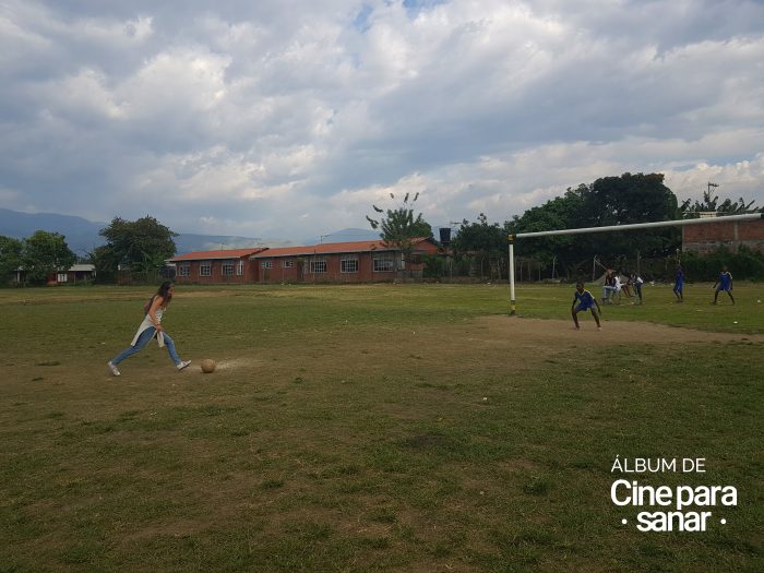 Laura, nuestra jefe de comunicaciones, no aguantó las ganas de hacer algunos tiros al arco en la cancha donde Yerry Mina metió sus primeros goles de cabeza. Esta, la única cancha de fútbol que hay en Guachené, es el lugar donde nacen y crecen los sueños de muchos niños que esperan seguir los pasos del futbolista colombiano.