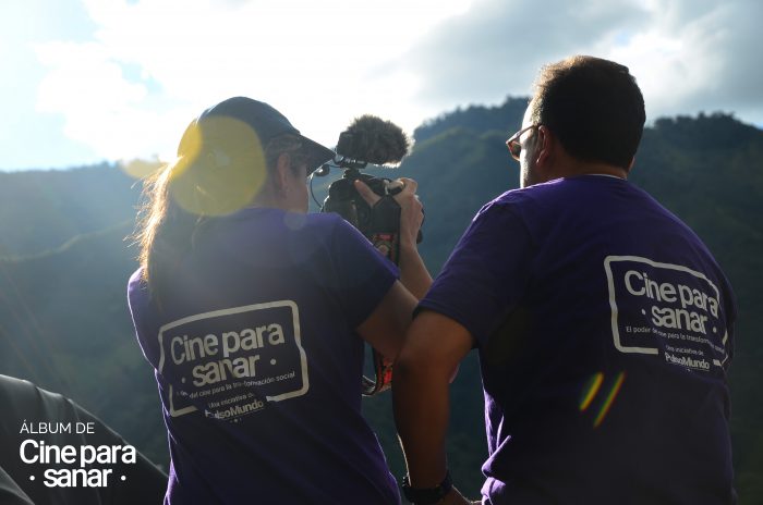 Sergio, nuestro productor, es el encargado (entre muchas cosas) de que la pantalla esté inflada y las sillas puestas a tiempo para cada proyección. En medio del ajetreo siempre encuentra tiempo para conocer las historias de los territorios que visitamos. En esta ocasión, un habitante de Planadas le contaba la historia del barrio que fundó las Farc en aquel municipio al sur del Tolima.