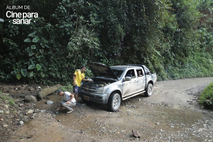 En el recorrido de Gaitania a Planadas, el carro en el que se transportaba el equipo de Cine para Sanar se recalentó. Afortunadamente, íbamos acompañados de dos ayudantes muy recursivos que aprovecharon el riachuelo por el que cruzábamos para resolver el problema.