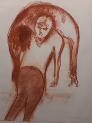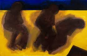 Ya desde hace unos años insiste en pintar y dibujar y ahora, con insistencia en papel de colgadura – que se encuentra en ambas exposiciones- la repetición exhaustiva de cadáveres que llevan a su propio entierro. Además, es la muerte violenta de campesinos. La guerra del campo donde la injusticia es la reina y donde viven los indefensos.