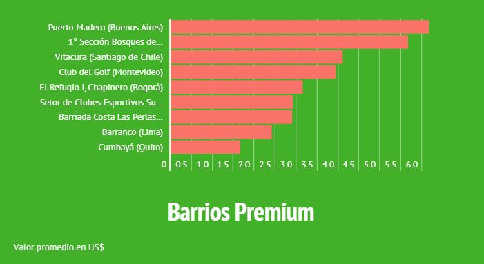 Por otro lado, Buenos Aires, capital argentina, es la que tiene los valores más elevados de m2 en su barrio más exclusivo. Puntualmente, los precios de su prestigioso barrio Puerto Madero se encuentra un 9% encima del que lo sigue, el barrio 1 Sección Bosques de Chapultepec en Ciudad de México.
