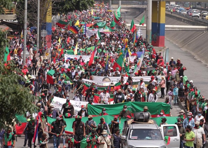 La Minga Indígena sigue su paso por Bogotá y ha recibido el apoyo de miles de personas que salieron a las calles de la capital. Una de las consignas que tienen es contra el presidente Iván Duque. "Duque, cobarde, el pueblo está que arde" fue una consigna que se ha dejado escuchar durante toda la mañana: