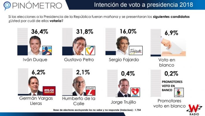 Llama la atención que en la encuesta de Datexco hecha para La W Radio el voto en blanco supera a Germán Vargas Lleras con un 6,9%. Mientras que Duque tiene mayor favorabilidad en la gente de 35 años hacia adelante y Gustavo Petro puntea entre los jóvenes. Faltando una semana la intención de voto de los candidatos parece no variar mucho y el comparativo en la encuesta de CM& entre el 2 de mayo y el 18 mantiene una tendencia de máximo tres puntos de crecimiento. Germán Vargas subió tres, Gustavo Petro dos y Sergio Fajardo uno, al tiempo que el candidato Iván Duque bajó dos puntos.