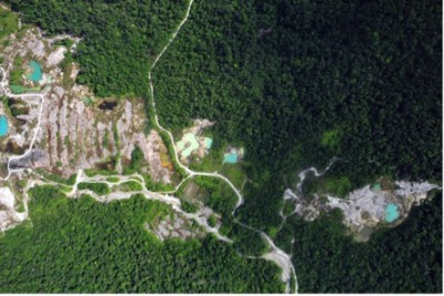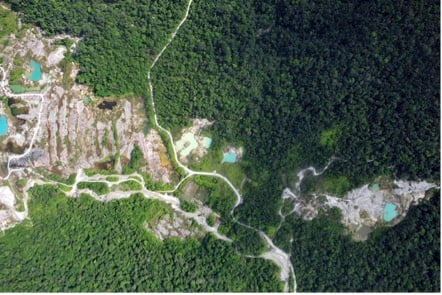 Después de una cena del Presidente Uribe con los Clinton en el 2010, Giustra obtuvo el permiso para su empresa maderera. La cicatriz en la selva por la tala puede verse en esta foto aérea. Foto vía UNPeriódico - Universidad Nacional