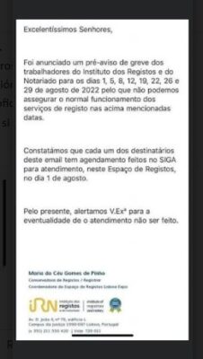 “Un aviso de huelga fue anunciado por los trabajadores del Instituto de Registro y Notariado para los días 1, 5, 8, 12, 19, 22, 26 y 29 de agosto de 2022, por lo que no podemos garantizar el normal funcionamiento de los servicios de registro en las citas programadas para dichas fechas.