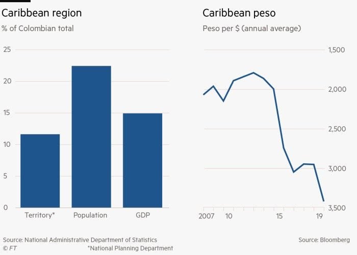 “Un tercio de sus habitantes viven en la pobreza. A nivel nacional, la cifra es del 19,6% y en la capital, Bogotá, solo del 4,3%, según la oficina nacional de estadística (Dane). Los ocho departamentos de la región representan el 22,4% de la población del país, pero solo el 14,9% de su PIB”, remarca.