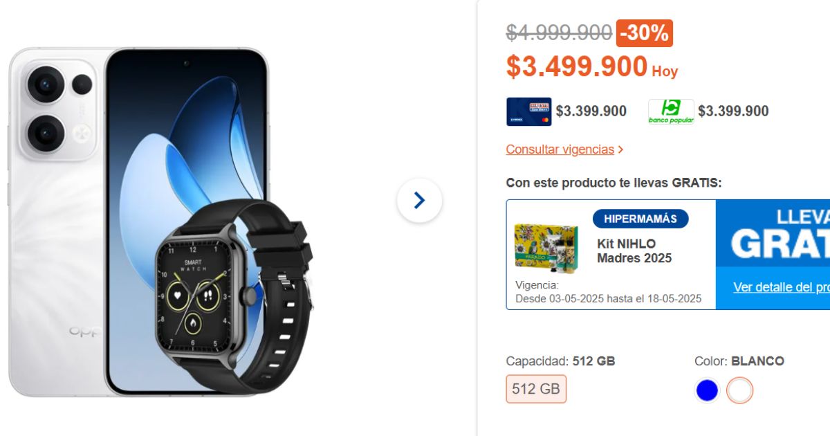 Al adquirir el OPPO Reno 13 5G en Alkosto, los usuarios reciben un reloj inteligente como obsequio, añadiendo valor a la compra. Asimismo, el dispositivo cuenta con un seguro gratuito por un año que cubre daños totales o parciales, brindando tranquilidad adicional al usuario.
