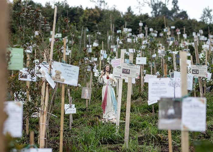 Un Sagrado Corazón de 50 centímetros de altura y una Virgen un poco más pequeña son los guardianes de 7 mil árboles y más de mil cenizas que están enterradas en este camposanto ubicado a 70 kilómetros de Bogotá. Foto: Leonel Cordero