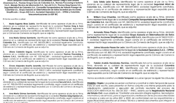 El billonario contrato contempló, principalmente, I) el proceso de inscripción de cédulas; ii) inscripción de candidatos; III) revisión de firmas de candidatos inscritos con movimientos significativos de ciudadanos; IV) solución informática y logística para la designación de jurados de votación; V) suministrar los kits electorales (tarjetones, cubículos, plumones); VI) autenticación biométrica; VII) solución informática y logística para información a ciudadanos y jurados de votación, para lo cual se desarrolló la aplicación móvil Infovotantes; VIII) asistencia para la designación de testigos electorales; IX) gestión y control de puestos; X) Procesamiento de datos electorales, el preconteo; XI) publicación en la web de las actas E-14 de claveros; XII) Servicios de recolección, digitalización, recolección, transmisión, publicación en la web y el proceso de interpretación y verificación de las imágenes de las actas de jurados de votación E-14 con destino a delegados. Además, entre las otras funciones que tenía la unión temporal estaban la protección de las comunicaciones internas en el proceso electoral y el soporte técnico para el proceso completo.