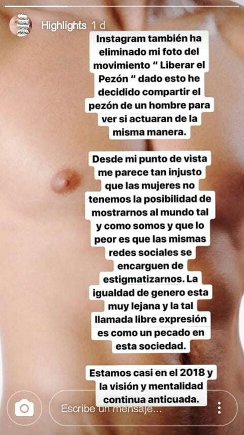 El día 15 de diciembre la modelo colombiana de talla grande María Jiménez publicó una fotografía como parte del movimiento Free The Nipple, “libera el pezón”, en las redes sociales de Facebook e Instagram en donde evidentemente muestra su pezón. Pese a ello, la fotografía fue eliminada de ambas redes sociales, una de las ya mencionadas redes le envió una nota de explicación donde le exponen que “no está permitido la publicación del pezón femenino, solo aquellas fotografías de cicatrices posteriores a una mastectomía o aquellas mujeres que estén amamantando”. Esto indudablemente molestó a la modelo, por lo que decidió publicar un pezón masculino esperando algún tipo de reacción de la red social Instagram, pero como se ha dicho anteriormente esto está permitido y por tanto no fue censurada.