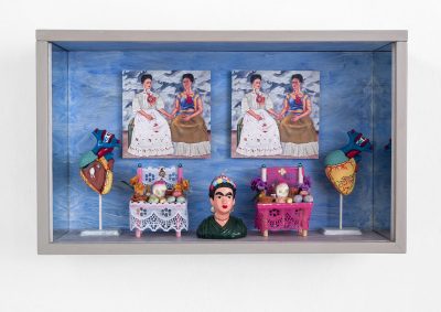 La caja de Elsa Zambrano, como siempre es una alegoría a la pintura, esta vez se trata de la obra de la mexicana Frida Kahlo, como siempre se mira a sí misma en medio del sufrimiento corporal. Las dos Fridas se ayudan a vivir y se matan. Los corazones laten y se detienen. El desafío de su agonía y su amor se reúnen en una sola tristeza. Además, Elsa Zambrano apoya su mexicanidad con las dos mesitas donde propone la importancia de lo popular.