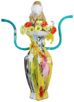 Por otro lado, se encuentra el jarrón chino de Vicky Newman. Sus porcelanas intervenidas siempre tienen una gracia y un atrevimiento especial. No trasforma la utilidad del objeto sino que lo interviene con otros elementos que hacen de su trabajo algo especial. Lo pinta sin que la porcelana pierda toda su dimensión. Lo utiliza como florero pero al mismo tiempo niega la posibilidad con el abrupto objeto que acompaña las flores y sus manijas innecesarias contradicen el material del jarrón. Una nueva historia del objeto.