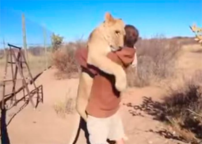 Gruener, el fundador del centro "Vida Silvestre Modisa" en Botsuana, ha cuidado desde pequeña a esta leona quien lo recibió con un fuerte abrazo tras una larga ausencia. Este es el conmovedor momento cuando se reencuentran: