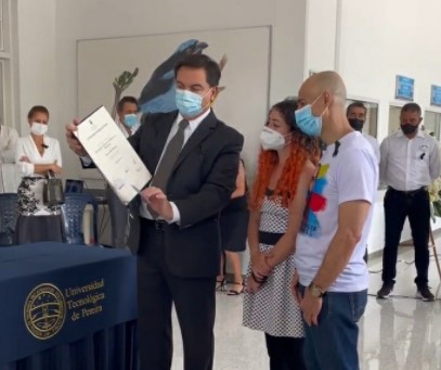 El rector Luis Fernando Gaviria hizo entrega del diploma del programa de Ciencias del Deporte y la Recreación, del que Lucas Villa cursaba noveno semestre. Foto: Vía Twitter