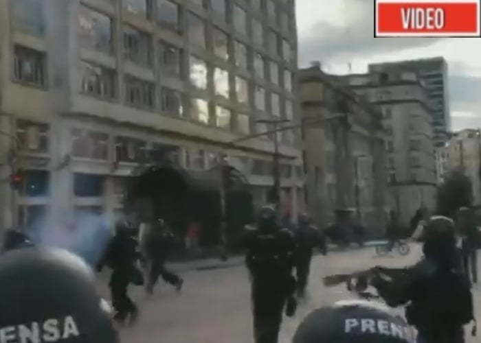 El concejal de Bogotá por el partido verde, Diego Cancino, desde su cuenta de Twitter denunció con este video, un presunto abuso de la fuerza por parte del escuadrón anti disturbios de la policía -ESMAD, contra los protestantes en el centro de la capital, uno de los puntos de congregación establecidos para las marchas.