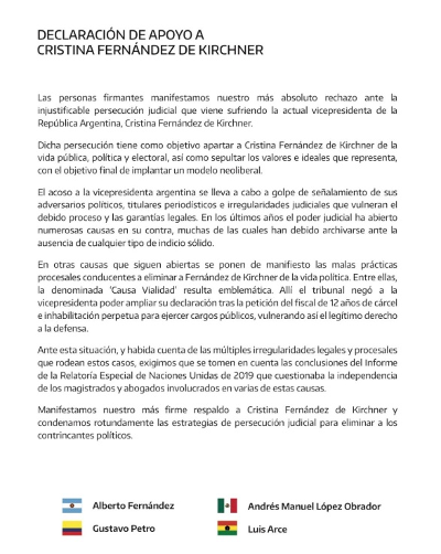 ¿Y qué se menciona en esa ‘Declaración de apoyo a Cristina Fernández de Kirchner’? Andrés Manuel López Obrador (presidente de los Estados Unidos Mexicanos), Gustavo Petro (presidente de la República de Colombia) y Luis Arce (presidente del Estado Plurinacional de Bolivia) manifiestan su ‘más absoluto rechazo ante la injustificable persecución judicial que viene sufriendo la actual vicepresidenta de la República Argentina, Cristina Fernández de Kirchner’.
