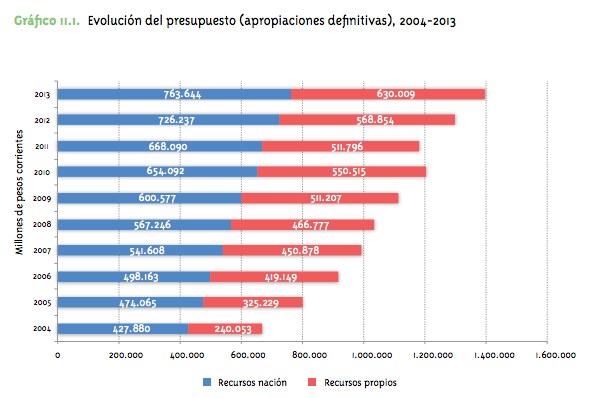 (2) Consejo Superior Universitario, Presupuesto en vigencia 2015: “Los aportes de la nación representan el 55.4% que equivalen a $801.894 millones y el 44.6% corresponden a recursos propios por valor de $645.961 millones”