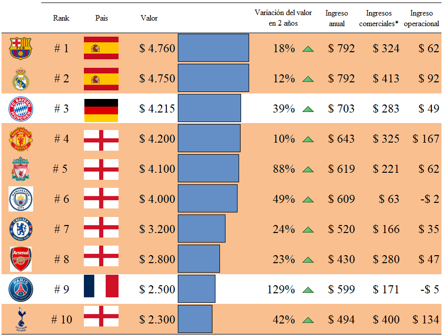 A su vez, estas escuadras hacen parte de los 20 equipos de fútbol más valiosos del mundo de acuerdo con la clasificación que realiza la revista Forbes publicada recientemente en el mes de abril, donde ocho de ellos ocupan las diez primeras posiciones, con el F.C. Barcelona a la cabeza, y un valor promedio por equipo de USD 2.280 millones, representando un aumento del 30% con relación a hace dos años, última vez que se realizó el ranking.