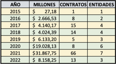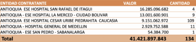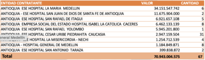 El siguiente cuadro muestra las contrataciones de FamySalud desde su fundación, donde se puede apreciar el gran incremento logrado en los años 2020 y 2021, de la Alcaldía de Daniel Quintero. Un aumento en la contratación que se debe principalmente al contrato con el Hospital La María en Medellín.