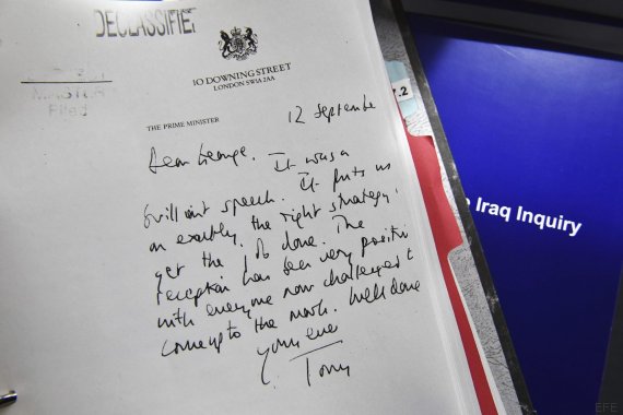 Hay otro asunto clave que el informe revela: Blair prometió en 2002 a Bush apoyo "incondicional" para invadir Irak. Así queda demostrado en las 29 cartas y notas que se han difundido este miércoles junto al informe, que se intercambiaron entre 2001 y 2007 ambos líderes, que acabaron formando una coalición militar, junto con José María Aznar, para atacar Irak y derrocar Sadam Hussein. Eso sí, sólo se han publicado las palabras del ex primer ministro británico y el informe descarta que hubiera "un pacto de sangre" entre Bush y Blair forjado en abril de 2002, cuando el exmandatario británico visitó a su socio por primera vez en su rancho de Crawford, en Texas.