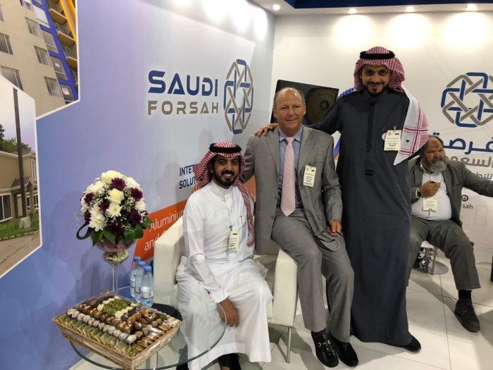 Felipe Otoya con los constructores en el stand de Forsa en Riad en Araia Saudita