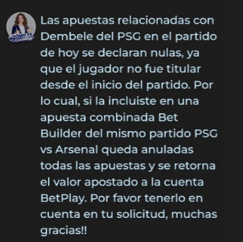 La respuesta que dio la casa de apuestas a los usuarios a los que les fue anulada su apuesta, es que la apuesta por Dembelé había sido anulada, debido a que el delantero no había sido titular. Condición que no fue señalada a la hora de hacer la apuesta. Los usuarios de la plataforma se han sentido engañados con este tipo de decisiones que toma la aplicación de anular las apuestas, para impedir que las personas ganen.