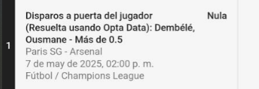 La situación ha sido la siguiente, los usuarios apuestan por el rendimiento de un jugador, por ejemplo, el partido de ayer por la Champions League, estaba abierta, la apuesta por el delantero estrella del PSG, Dembelé, hiciera más de 0.5 disparos a portería. Debido a que la probabilidad de que el jugador realizara, aunque sea, un disparo al arco era bastante alta, la cuota de ganancia era, aproximadamente, x 1.36, un margen de ganancia bastante moderado.