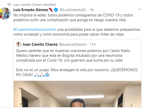 El diputado del Meta Juan Camilo Chávez fue quien mandó la alerta: un médico de Villavicencio, Juan Camilo Chávez alertó desde su Twitter que el médico nacido en Villavicencio estaba entubado por una neumonía producto del COVID 19