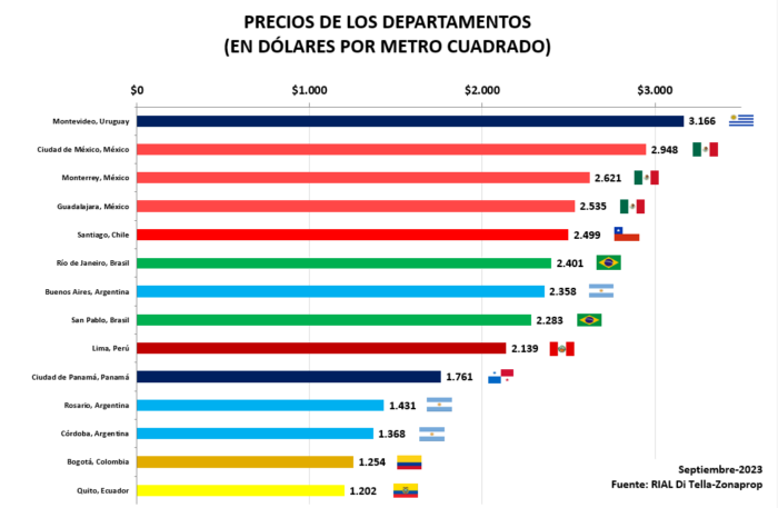 El primer lugar de la clasificación lo ocupó Montevideo, capital de Uruguay, con un precio promedio que casi triplica al de Bogotá (USD 3.166). Por su parte, el top 3 lo completan dos ciudades de México, por un lado, la capital con USD 2.948 y por el otro, Monterrey con USD 2.621.