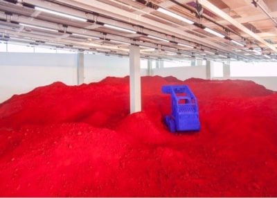 Sin duda es una obra de Anish Kapoor poderosa porque busca otra manera de conmover. Una instalación se titula: Destierro y la otra Angustia. Son obras conceptuales que trabaja con el color y el espacio con magnetismo y la capacidad de conmover sin representar. Maneja la tierra y los pigmentos rojos. Tierra de destierro, tierra de la no pertenencia, del asilo, de la pertenencia. Tierra de la vida y de la muerte. Tierra de nadie. Encima, una máquina en azul cobalto que remueve indiscriminadamente la vida.