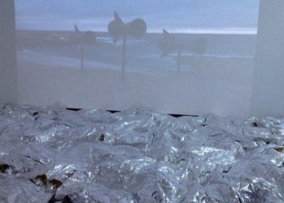 En el museo de Bellas Artes presentó Boltanski otra obra. Videos en blanco y negro del mar de la Patagonia y en uno de ellos aparecen parlantes precarios que emiten los ruidos de las ballenas para comunicarse con ellas. El mar, que es una distancia figurada, lo inventó con hojas en papel de aluminio