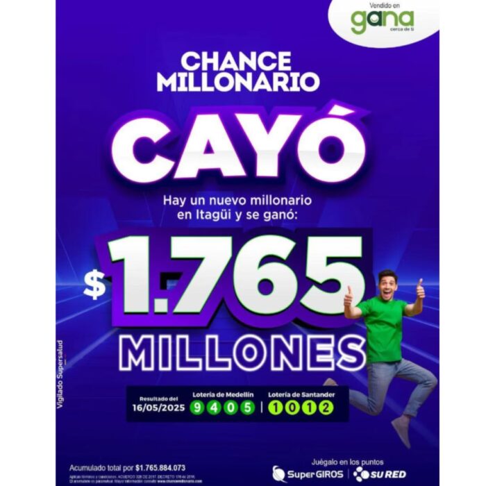 Un golpe de suerte monumental cambió la vida de un apostador en Itagüí, Antioquia, luego de que la Red Gana confirmara la entrega de un premio por 1.765.884.073 pesos en la modalidad Chance Millonario. El afortunado acertó simultáneamente los números ganadores de la Lotería de Medellín (9405) y la Lotería de Santander (1012), sorteos celebrados la noche del viernes 16 de mayo, donde este paisa que se volvió millonario.